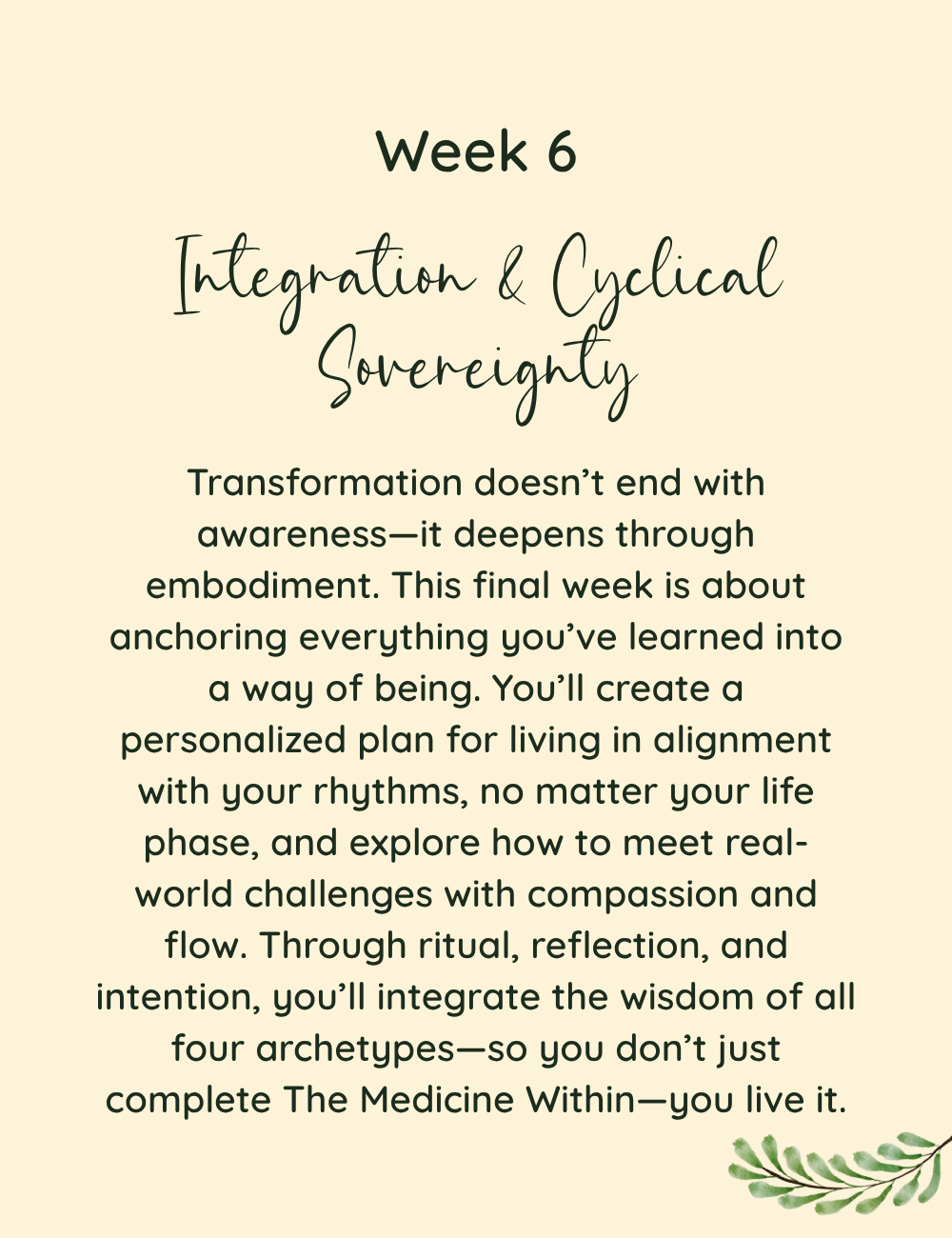 Melissa believes that cyclical living is a birthright and a profound source of power that has been forgotten and suppressed in modern society. Through her retreats, private coaching, and The Medicine Within course, she helps women move beyond viewing their cycles as a burden and instead embrace them as a source of wisdom, strength, and deep self-trust.